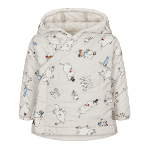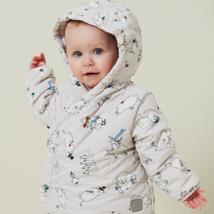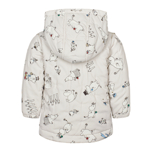 Thermojacke mit Mumin-Print und Kapuze. Die Jacke wird seitlich mit einem Reissverschluss geschlossen. Sie ist aus leichtem Material gefertigt und verfügt über Gummizügen an den Ärmeln für eine bequeme Passform. Die Jacke eignet sich perfekt für die Übergangszeit.