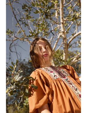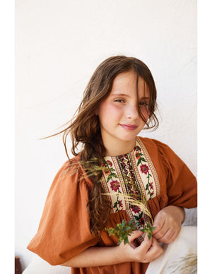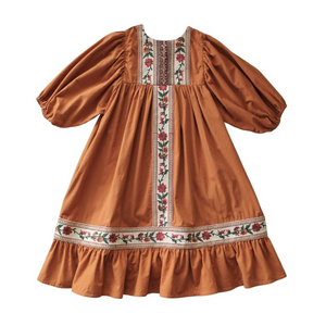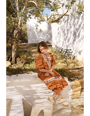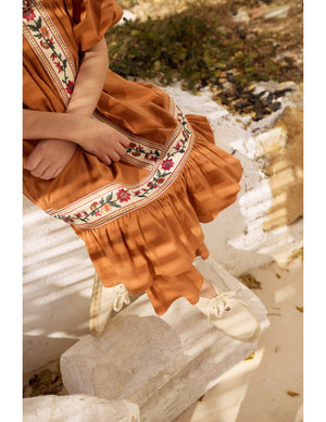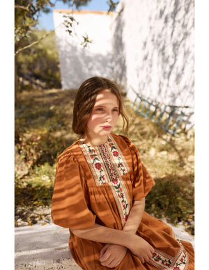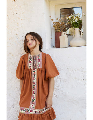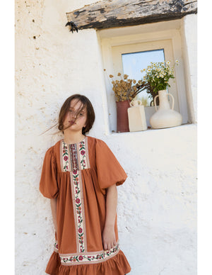 Dieses bezaubernde Kleid aus 100% Bio-Baumwolle ist perfekt für besondere Anlässe oder entspannte Sommerabende. Die Stickereien verleihen ihm eine elegante Note. Mit weiten Armöffnungen, Puffärmeln und elastischen Bündchen bietet es zusätzlichen Komfort. Der Rock ist mit einem weiten Volant, gestickter Borte am Saum und einem gerafften Volant ausgestattet, was dem Kleid einen verspielten, femininen Look gibt. Eine Öffnung am Rücken mit verdecktem Knopf und praktische Seitennahttaschen runden das Design ab.