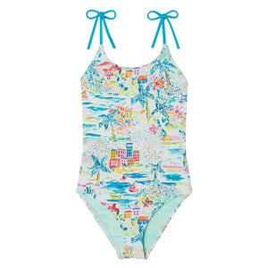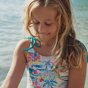Hochwertiger Badeanzug aus europäischem Recyclingmaterial mit Sonnenschutz UPF50+. Dank der verstellbaren Träger passt er sich perfekt an die Morphologie jedes Kindes an und bietet optimalen Komfort. Der exklusive Aufdruck besticht durch seine leuchtenden und fröhlichen Farben.
