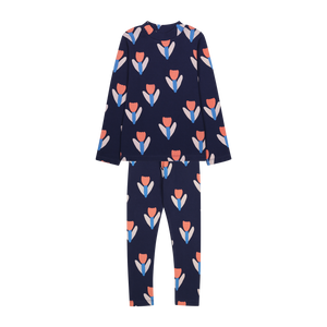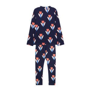Zweiteiler aus weicher Baumwolle in Navy mit rot-blauem Tulpen-Alloverprint. Sieht nach Statement aus, fühlt sich nach Wohlfühlteil an.