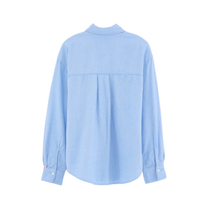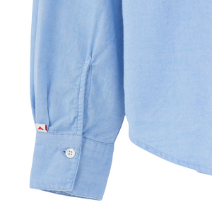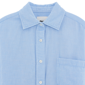 Gefertigt aus extra weichem, leicht angerautem Baumwoll-Twill in Hellblau. Mit Hemdkragen, Knopfleiste vorne, aufgesetzter Brusttasche und Rückenfalte für mehr Bewegungsfreiheit. Abgerundeter Saum im typischen Hemd-Stil.