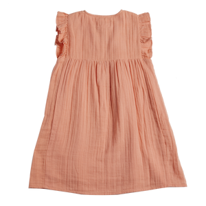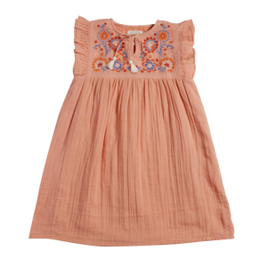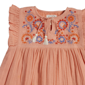 Sommerkleid aus apricotfarbener Doppelgaze mit schöner Stickerei und Kordeln mit kleinen Tasseln an den Enden.