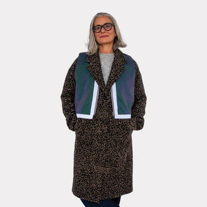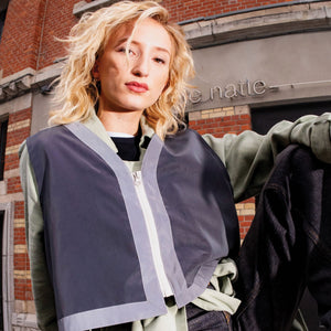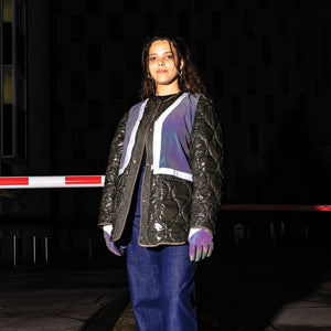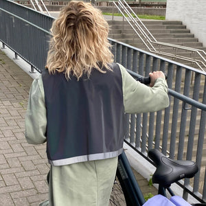 Beautiful reflective vest from GOFLUO. At night, it makes you visible from up to 150 m away. And it also looks great during the day over a long coat with its gray shimmer effect. The shortened cut means you always have access to the coat pockets;