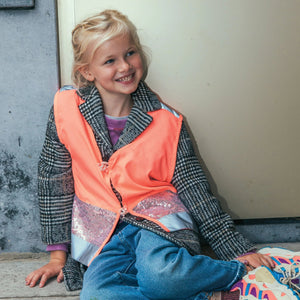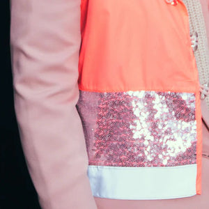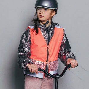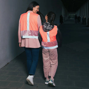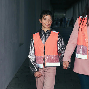 The vest shines in bright coral red and is decorated with glittering, pale pink sequins. The wide reflective stripes on the front and back make it particularly visible in the dark. It fastens with a simple toggle fastener.
