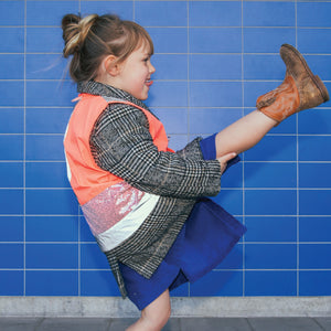 Die Weste leuchtet in hellem Korallenrot und ist mit glitzernden, blassrosa Pailletten verziert. Die breiten Reflexstreifen auf der Vorder- und Rückseite machen sie im Dunkeln besonders gut sichtbar. Sie wird mit einem einfachen Knebelverschluss geschlossen.