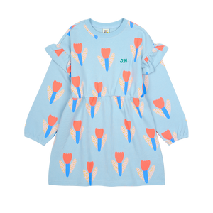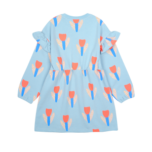 Allover-Tulpenprint in Rot und Blau auf hellblauem Grund, Rüschen-Details und Drop-Shoulder – comfy trifft verspielt.