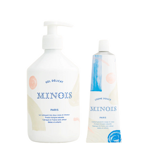 The delicate wash gel (500ml) for body and hair and the gentle face and body cream (100ml). Both suitable from birth.