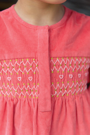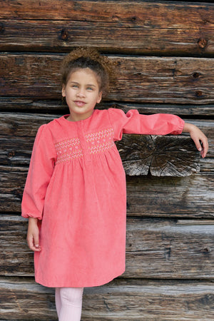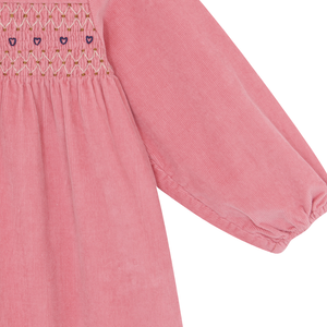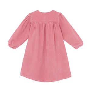 Rosa Samtkleid mit voluminösen Puffärmeln, verspielten Knöpfen hinten und handbestickten Verzierungen – mit ausgestelltem Schnitt für viel Bewegungsspielraum.