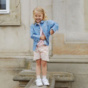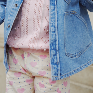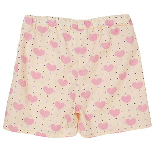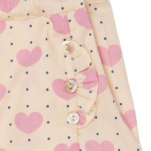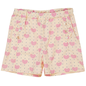 Playful shorts with ruffle pockets and a cute heart and polka dot print. They are made from soft, breathable material and offer all-day comfort for active children. With their loose fit and pretty design, these shorts are perfect for trips to the park or sunny days at home.