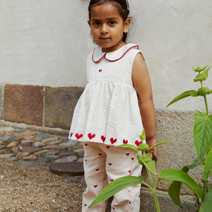 Sleeveless top made of seersucker fabric with a fine pink stripe, collar and embroidered hearts.
