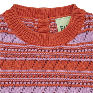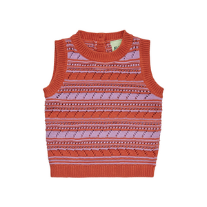 Vest knitted in a textured pointelle pattern. It has a regular fit, a round neckline and ribbed cuffs at the armholes and bottom hem. It has a practical button fastening with mother-of-pearl buttons at the back. It is made from organic cotton and is suitable for wearing over or on its own.