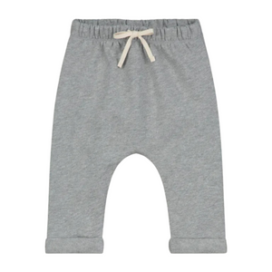 Trousers made from soft organic cotton fleece with an elastic waistband with drawstring and a back pocket. The leg is slightly tapered and has turned-up hems.