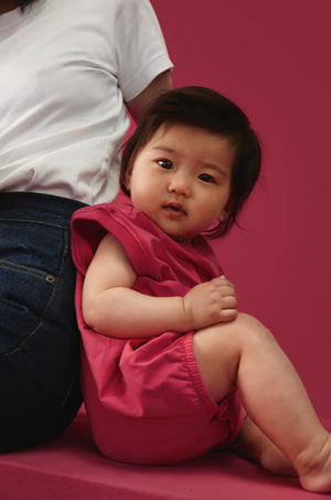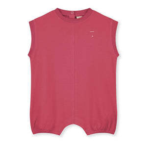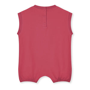 Sleeveless playsuit made from soft organic cotton. With rib-knit details on the neck, sleeves and leg cuffs and a press stud fastening at the crotch.