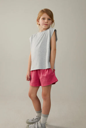 Loose-fitting shorts made from soft organic jersey cotton. Featuring an elasticated waistband (adjustable), side pockets and a patch pocket on the back.