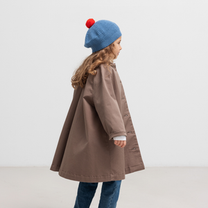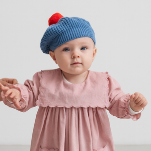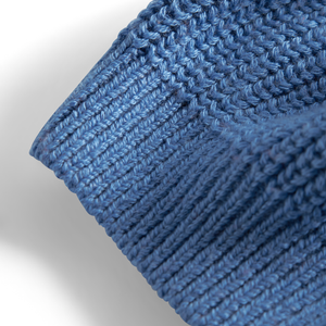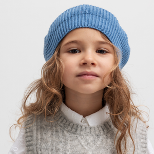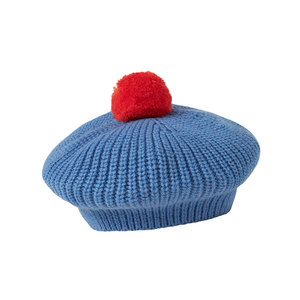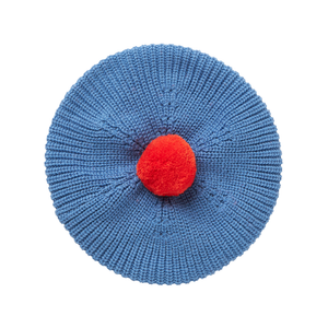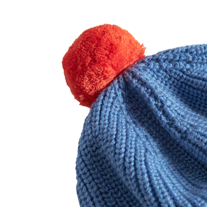 Strickmütze mit Bommel. Die Mütze hat eine runde Form und sitzt gut auf dem Kopf.