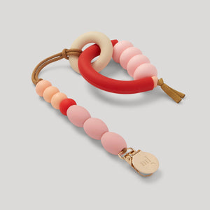 Schöner verspielter Beissring aus 100% lebensmittelechtem Silikon der dank dem praktischen Klipp nie verloren geht.