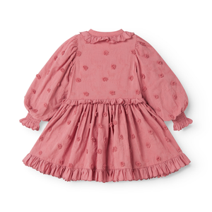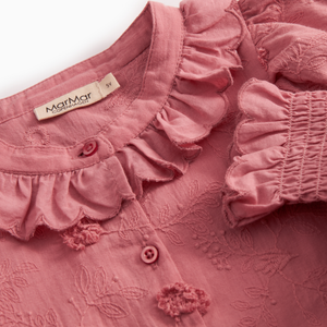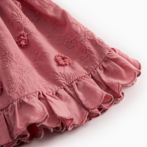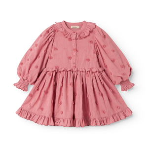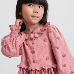Kleid mit einzigartigen Stickereien und kleinen Blumen. Das Kleid hat feine Rüschendetails an den Schultern und am Saum, voluminöse Ärmel mit Smokarbeit an den Handgelenken und einen Knopfverschluss vorne. Die Länge des Kleides reicht bis über das Knie und eignet sich sowohl für den Alltag als auch für festliche Anlässe.