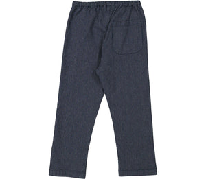 Comfortable children's trousers in chambray denim with a loose fit, a pocket on the back and an elasticated waist.