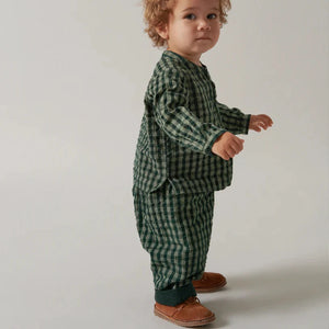 Comfortable trousers in seersucker gingham with a loose fit, a pocket on the back and an elasticated waistband. The trousers are lined.