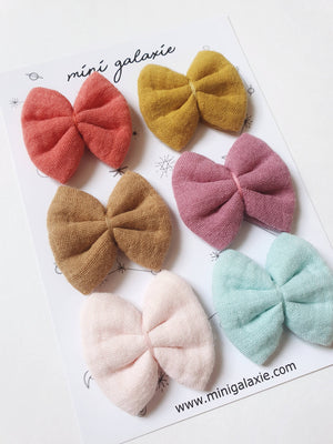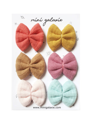 Set mit sechs schlichten Mini-Schleifenclips aus Baumwollmusselin. Die Schleifen sind auf jeweils auf einer 3 cm grossen Haarspange montiert.