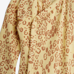 Wonderfully soft and cosy baby set with wrap bodysuit, leggings and hat in leopard print. The bodysuit has a press stud fastening on the front for easy dressing, the leggings have a soft, elasticated waistband with cuffs at the ends and the hat has ties to tie under the chin.