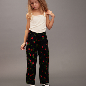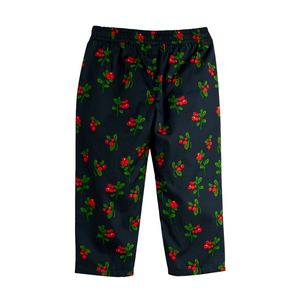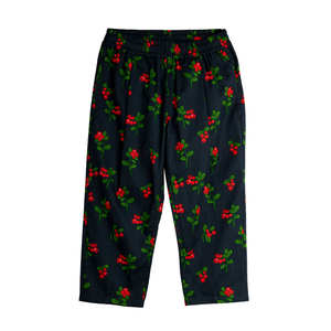 Aus 100% Baumwolle, gewoben mit elastischem Bund und seitlichen Eingrifftaschen. Atmungsaktiv und angenehm auf der Haut. Der fröhliche Preiselbeer-Allover-Print sorgt für ein verspieltes Design auf tiefschwarzem Grund.