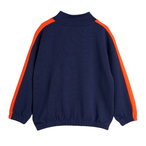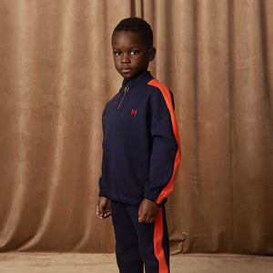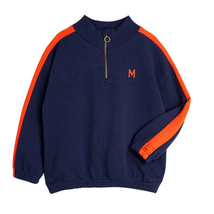 Sweatshirt with a zipper at the neckline, inset red stripes on the sleeves and a small embroidered M on the chest.