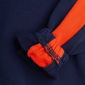 Sweatshirt mit Reissverschluss am Halsausschnitt, eingesetzten roten Steifen an den Ärmeln und einem kleinen aufgestickten M auf der Brust.