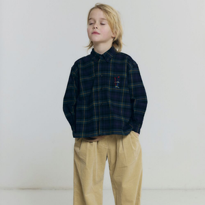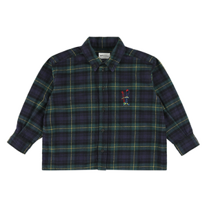 Aus 100 % Baumwolle. Weicher Flanell mit grün-blauem Karomuster und feinen gelben Linien. Highlight: eine farbenfrohe Stickerei zweier stilisierter Figuren – eine in Rot, eine in Blau – mit bunten Akzenten und kleinem roten Hut.