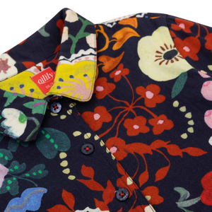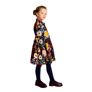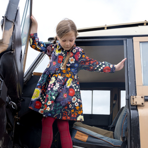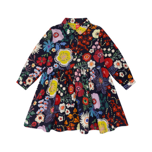 Ein traumhafter Blumenprint von Nathalie Lété trifft auf ein neu interpretiertes Oilily-Archivstück. Mit hübschen Bündchen, ausgestelltem Rockteil und Bindeband am Rücken.