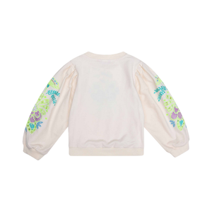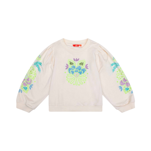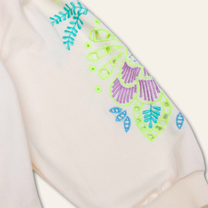 Dieser hübsche Pullover überzeugt durch seine liebevollen Details. Die Blumen sind mit grosser Sorgfalt auf Bauch und Ärmeln gestickt und vereinen Garn, Perlen und Pailletten in perfektem Einklang. An den Ärmeln finden sich zudem filigrane Lochstickereien.