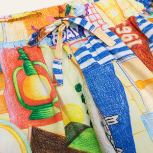 Der Druck besteht aus lustigen Camping-Utensilien und ist von Hand gezeichnet. Das Design macht diese Shorts herrlich fröhlich und sonnig.