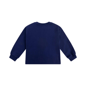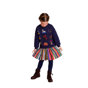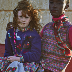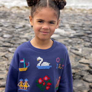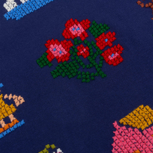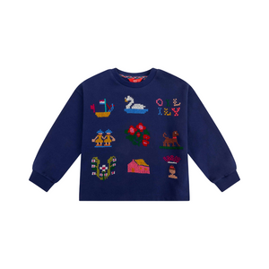 Ein klassischer Sweater mit besonderem Twist: Bunte Kreuzstich-Stickereien auf dunkelblauem Grund bringen verspielte Motive zum Leuchten.