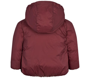 Downenjacke mit Kapuze. Die Jacke wird mit einem Reissverschluss seitlich geschlossen.
