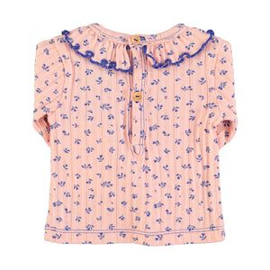 Oberteil mit blauen Blümchen und Rüschen Detail am Halsabschluss.