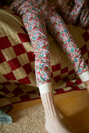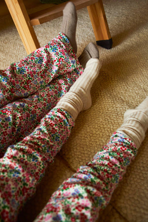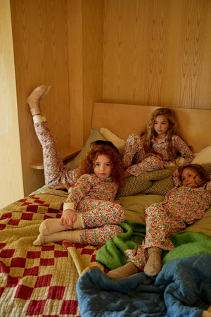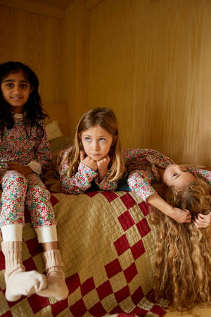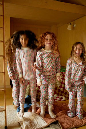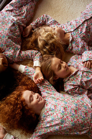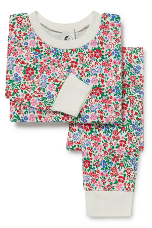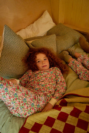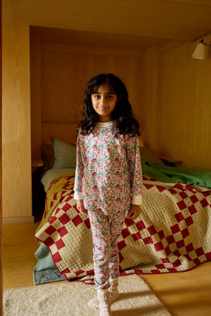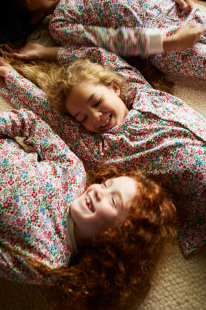 Schlafanzug für Kinder mit einem farbenfrohen, festlichen Blumendruck aus weichem Interlock-Gewebe. Hergestellt in Grossbritannien.