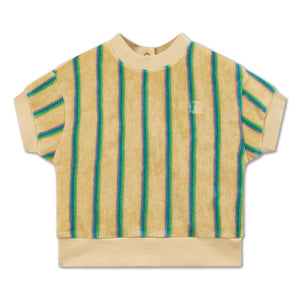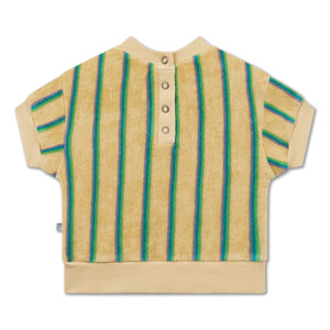 Das T-Shirt ist aus weichstem Bio-Baumwollfrottee gefertigt, der sanft zur Haut ist und auch nach vielen Wäschen und Tragen seine Form behält. Es hat einen Rundhalsausschnitt, kurze Ärmel, ein gesticktes Logo auf der Brust und Druckknöpfe auf der Rückseite für ein einfaches Anziehen.