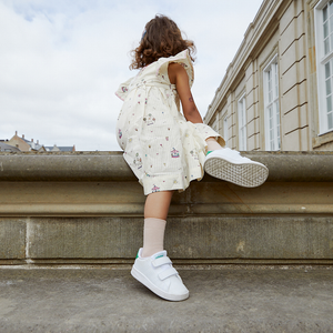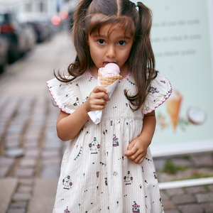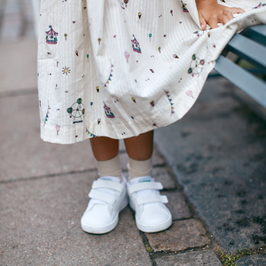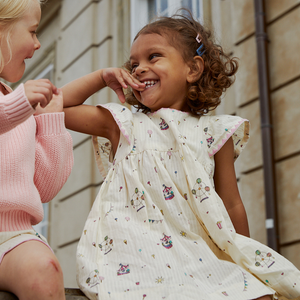 With this irresistibly cute, printed dress with pink piping on the ruffled hem, there are no limits to the play. The dress is made from 100% organic cotton and has a woven dobby structure. It is cut in such a way that you can move around easily and play carefree. The dress is easy to care for and retains its shape even after repeated washing.