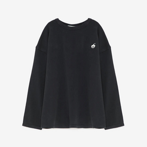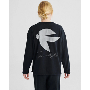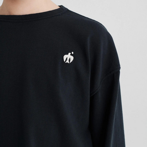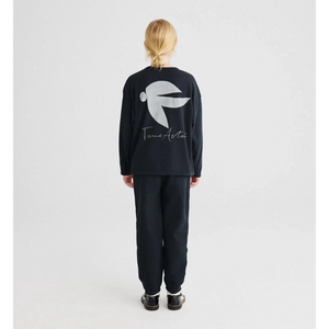 T-shirt no. 02 in black is made from 100% organic cotton. It has an embroidered bird logo on the chest and a large bird print on the back. It has a loose fit, a round neckline and long sleeves.