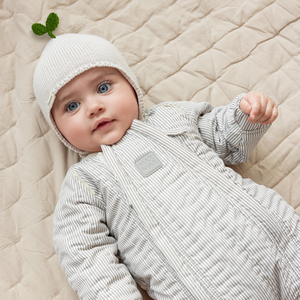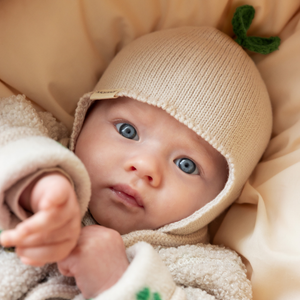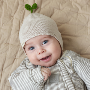 Die Strickmütze ist weich, warm und angenehm zu tragen. Sie wird mit einem Riemen unter dem Kinn befestigt, der mit einem Knopf auf zwei Längen eingestellt werden kann.
