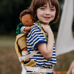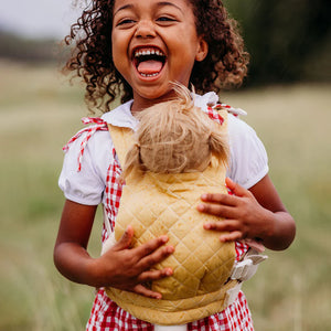 Dinkum Doll Carrier – Gold: Gepolsterter Puppenträger aus Baumwollcanvas mit verstellbaren Gurten, geeignet für die meisten 34 cm Puppen (max. 0,5 kg). Kann vorne oder hinten getragen werden.