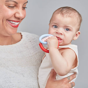 Der schöne Beissring besteht zu 100% aus lebensmittelechtem Silikon. Er ist leicht zu greifen, in den Mund zu nehmen und zu handhaben.