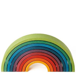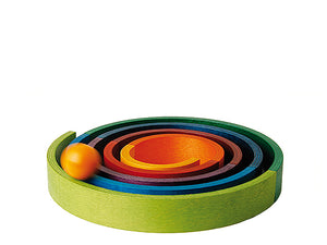 Neun Bogenelemente aus Ahornschichtholz sind Spielobjekt und Klangkörper zugleich. Brilliante Regenbogenfarbtöne und das hochwertig verarbeitetete Holz machen Rainbow zu einem Spiel- und Kunstobjekt mit grosser haptischer Qualität. Virtuos die Balance finden, schwer ist es nicht, denn es gibt viel zu entdecken. Leuchtkraft und Schlichtheit der Bogenelemente verführen immer wieder dazu, Farben und Klänge neu miteinander zu kombinieren und die Kugel rollt auf der „Regenbogenbahn“.