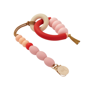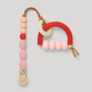Schöner verspielter Beissring aus 100% lebensmittelechtem Silikon der dank dem praktischen Klipp nie verloren geht.