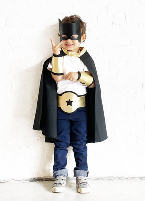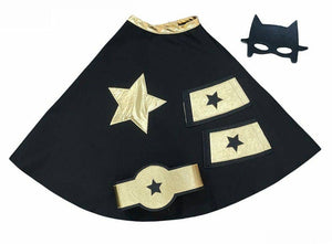 Das schwarz-goldene Superhelden-Kit beinhaltet: 1 schwarzer Umhang mit goldenem Stern, zwei goldene Manschetten mit schwarzem Stern, ein goldener Gürtel mit schwarzem Stern und eine Maske.